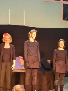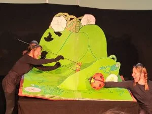 Les deux comédiennes, Patricia Wagnon et Zélie Vicier, à l’origine de cette création (avec Alice Maurel de la Cie le Chardonneret), et leur nouvelle Musicienne Valérie Gourru, ont fait deux représentations le vendredi 24 pour les élèves de maternelle et feront des ateliers d’EAC le lundi 27 et mardi 28 pour ces bambins sur la thématique du cocon, de la chenille et des insectes (théâtre, pop up et éveil musical).